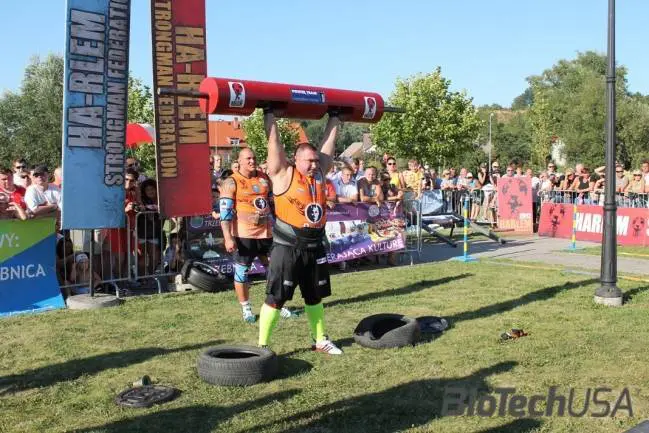 Olyan nehéz, amilyet én még nem láttam a profik között sem, és ami a mezőny felén kifogott. Elsőre egy 165kg-os rönköt kellett kinyomni a domb aljában, aztán futás középre, ott egy 96kg-os egykezest kellett kétszer (!!!) kinyomni (és nem szakítani, mint az itthoni versenyeken…), végül a domb tetején még egy kedves 180kg-os farönk nyomása várt a legjobbakra. Sajnos a 165kg-os rönk kinyomásakor (ami egyébként egyezik az egyéni legjobbammal, amit az idén nyomtam) nagyon alá kellett tolnom a csípőmet, és sikerült meghúzni a derekam. Volt az idén már ilyen sérülésem, de most nem akartam kockáztatni tovább, alig egy hónappal a World Strongest Man előtt. A nyomószámot Misha nyerte Savickas és Radzikowsky előtt, csak ők hárman tudták végig nyomni a feladatot.